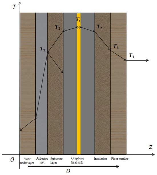 - Assuming that there is good contact between layers without a temperature drop at the interlayer interface, contact thermal resistance is not introduced. Since effective heat transfer occurs only from the heating layer of the floor to the surface layer of the floor, the model is simplified as a one-dimensional heat transfer problem with heat conduction occurring only in the vertical direction, without considering other uneven heat sources and heat transfer processes;