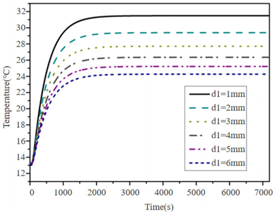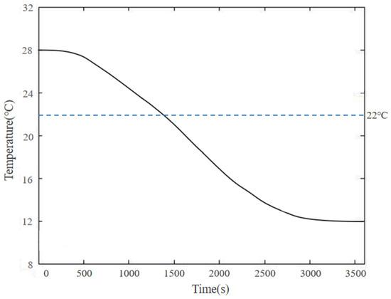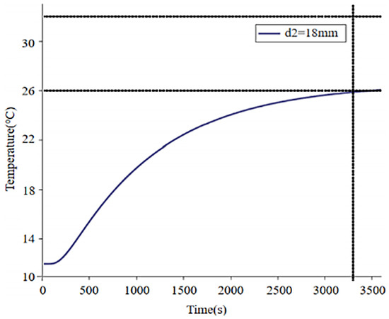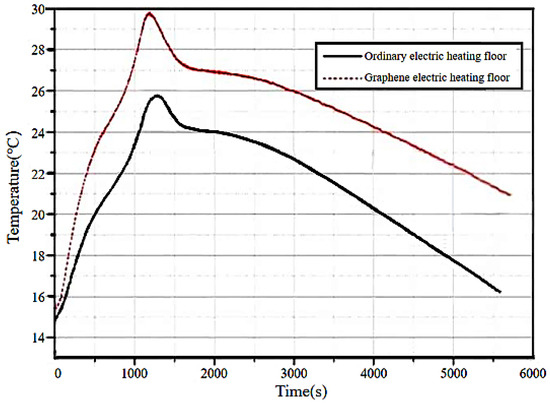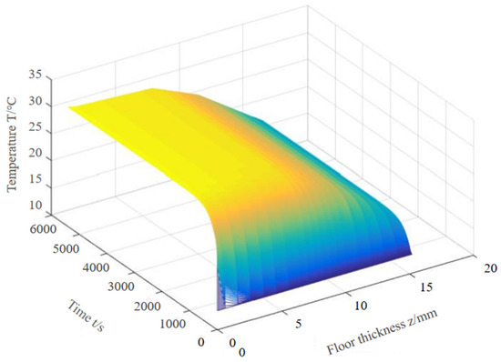 - This study established a three-dimensional model of a graphene electric heating floor and simulated the heat transfer process using the finite difference method. We found that for a thickness of 18 mm, it takes approximately 27 min (1620 s) for the surface to reach 22 °C; 56 min (3360 s) to reach 26 °C; and 109 min (6540 s) to reach 28 °C. After turning off the power, it takes 25 min (1500 s) for the floor surface to return to 22 °C;