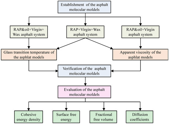 For this purpose, a molecular dynamics model of warm mix recycled asphalt binder was designed to explore the effects of the dual action of wax-based additives and oil-based rejuvenators on the diffusion behavior and thermodynamic properties of virgin and RAP binders. The glass transition temperature and apparent viscosity simulated values of the warm mix recycled asphalt binder molecules were first compared with the experimental values to verify the correctness of the asphalt molecule modeling. Meanwhile, the cohesive energy density (CED), self-healing potential, fraction-free volume (FFV), and diffusion coefficient were computed to evaluate the difference between asphalt binders in thermodynamic properties and diffusion behavior after introducing the warm mix additives and rejuvenators. The findings of this paper aim to reveal the thermodynamic performance and microscopic diffusion mechanism of warm mix recycled asphalt with a high RAP binder content from the molecular level. The specific research plan for this research is presented in Figure 1.