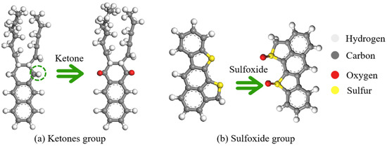 Asphalt pavements are continually subject to environmental influences, leading to irreversible alterations like chemical deterioration, the expulsion of volatile components, the depletion of lighter materials within aggregates, and stiffening as a result of temperature fluctuations, humidity, and traffic stress [39]. Among these, asphalt aging is mainly caused by oxidation, which happens in two stages [40]. At elevated temperatures, small alkanes rapidly volatilize, while alkyl groups on benzene rings undergo oxidation to form carboxyl groups, frequently converting long-chain alkyls into benzoic acid. As aging progresses, oxygen replaces hydrogen on benzyl carbon, forming ketones, which increases the concentration of ketones and sulfoxides. Figure 2 illustrates the major changes in the chemical structures of asphalt binders during the oxidative aging process. These changes result in a decrease in the content of resin and aromatic fractions, while asphaltenes increase sharply [41]. The complex aging processes drive the original stable colloidal structure of asphalt binders into an unstable one. Notably, the saturate fractions remain stable during oxidative aging, and this assumption has been widely used in previous molecular dynamics (MD) simulations [42]. Figure 3 shows the evolution of the asphalt molecules from the virgin binder to the RAP binder, and Table 1 records the components and molecular formulas of the RAP asphalt binders [43]. All aging processes were simulated at the molecular level, focusing on diffusion and thermodynamic behavior rather than fully capturing all physical processes.
