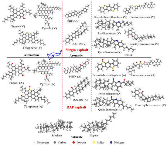 Molecular structures of the virgin and aged asphalt binders [43].