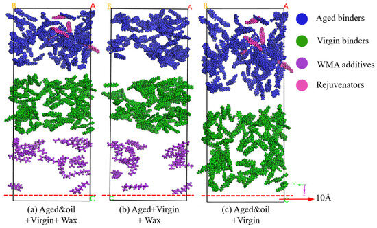 To reveal the diffusion mechanism of warm mix recycled asphalt binders, three different mutual diffusion systems were established in MS (as shown in Figure 6). The Build Layers module in MS was used to assemble the RAP binders (blended with rejuvenators)–virgin binders–WMA additives as well as the RAP binders–virgin binders–WMA additives three-layered mutual diffusion system, respectively. In addition to this, a double-layered mutual diffusion system of RAP binders (blended with rejuvenators)–virgin binders was developed as the control group to study the effects of the WMA additive on the interdiffusion between aged and virgin asphalt molecules. In the system containing rejuvenators and WMA additives, the aged binders layer consisted of 72 RAP asphalt molecules and 5 rejuvenator molecules, and the virgin binders included 72 unaged asphalt molecules, while the third layer comprised 14 wax WMA molecules (equal to 3% of the total binder’s content). As depicted in Figure 6, a vacuum layer of 10 Å was added on the Z-direction edge side of the diffusion, indicating that the Z direction was assigned a non-periodic condition, while the X and Y directions retained their periodic boundaries.