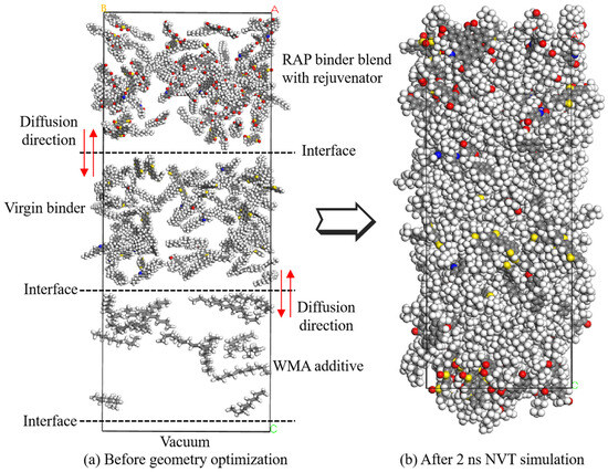 Due to the influence of complex environmental factors and heavy traffic loads, an asphalt binder is susceptible to the risk of cracking during its service life [50]. These microcracks in asphalt binder can be repaired at a certain temperature threshold, which is called the self-healing process of asphalt binder [50]. In the asphalt molecular system, this self-healing process is generally characterized by changes in the asphalt density [48]. As exhibited in Figure 7, the 10 Å vacuum middle layers set in the asphalt molecular system were used to simulate microcracks in the asphalt binder. To capture the self-healing process, an MD simulation of 500 ps was conducted by employing the NPT ensemble at 1 atm and 298 K. During the simulation, the mutual diffusion between the upper and bottom layers of the asphalt molecular system was used to stimulate self-healing. When the density of the asphalt molecular system reached a stable level, it was considered fully self-healed. Thus, the time taken to reach a stable level was used as an evaluation index to assess the self-healing ability of warm mix recycled asphalt binders with and without rejuvenators.