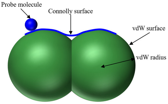 The Connolly surface, as depicted in Figure 8, is generated by moving probe atoms of radius RP along the exterior of these atoms within the asphalt molecular system. Based on this, Equation (5) is further transformed into Equation (6):