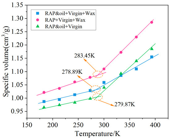 The glass transition temperature (Tg) of an asphalt binder is a significant index in evaluating the complex low-temperature behavior of asphalt and its mixtures [52]. In this section, the specific volumes of each asphalt system were computed based on the corresponding simulated asphalt density results (the reciprocal of density). The data points for volume–temperature relationships in various zones were individually modeled, as illustrated in Figure 9. Tg points are determined by analyzing the characteristics of these fitting curves, marking them as the transition between the glassy and viscoelastic regions [48]. Generally, the asphalt binder with a low Tg corresponds to better cracking resistance at low temperatures [52].
