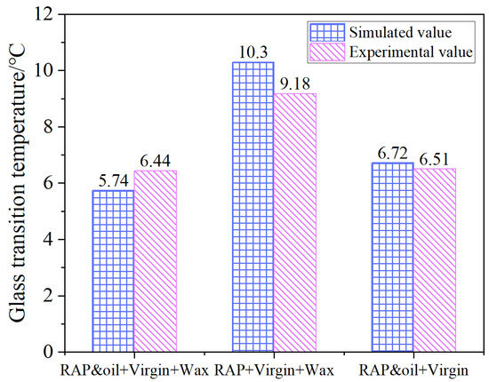 As illustrated in Figure 9, the simulated Tg values of RAP and oil + virgin + wax asphalt system, RAP + virgin + wax asphalt system, and RAP and oil + virgin asphalt system are 278.89 K (5.74 °C), 283.45 K (10.3 °C), and 279.87 K (6.72 °C), respectively, all falling in the normal glass transition temperature range (i.e., 223–303 K) reported in the previous literature [49]. The presence of organic wax WMA additives and RAP binders increases the Tg value, while the introduction of oil rejuvenators offsets this effect. The Tg of the bitumen used in this study was measured under specific conditions and may vary depending on the composition and additives employed. While a Tg greater than 0 °C may seem high, it is important to note that the bitumen selected for this study was chosen for its particular characteristics relevant to warm mix asphalt (WMA) performance, and it may still provide effective mixing and compaction temperatures under the conditions tested. This highlights the importance of using oil rejuvenators along with WMA additives to achieve desired low-temperature cracking resistance in warm mix recycled asphalt binders. It can be concluded that the presence of organic wax WMA additives and RAP binders increases the value of Tg, and the introduction of oil rejuvenators offsets the detrimental effects on Tg value. The increase in Tg indicates the glass transition of asphalt and its mixtures will undergo at higher temperatures, leading to the earlier cracking of asphalt pavements. For the RAP + virgin + wax asphalt system with the highest Tg value, it may be ascribed to the presence of oxidatively aged RAP binders, which contributed to the increase in stiffness to the asphalt system, inducing the glass transition at a not-very-low temperature. As reported in previous studies, the oxidative aged RAP binders raise the Tg from 271.96 K to 292.73 K [49], demonstrating that the risk of asphalt cracking increased a lot. Additionally, organic waxes behave as solids at room or lower temperatures, which also favors the increase in asphalt stiffness. Consequently, the dual contributions of organic waxes and aged RAP binders to asphalt stiffness result in the highest Tg value of the RAP + virgin + wax asphalt system. After the rejuvenating agent was incorporated into the asphalt system, the Tg value decreased from 10.3 °C to 5.74 °C. This indicates that the addition of rejuvenating agents significantly improves the anti-cracking resistance. This is mainly attributed to the presence of aromatic oil softening the stiff organic waxes and aged RAP binders, and, thus, the glass transition temperature of the RAP and oil + virgin + wax asphalt system decreased largely. In conclusion, oil rejuvenators must be added alongside WMA additives in warm mix recycled asphalt binders to enhance resistance to low-temperature cracking.