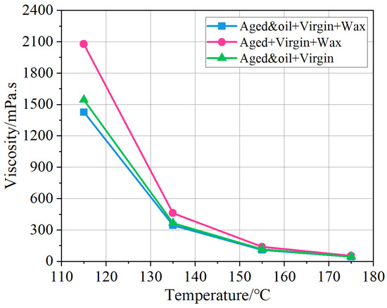 Through the WLF model described in Section 3.1, the apparent viscosities of the warm mix recycled asphalt binders with and without rejuvenators were calculated, and the viscosity change curves at different temperatures were plotted, as exhibited in Figure 11. As can be discovered in Figure 11, all the viscosity decreases with increases in temperature because the forces between asphalt molecules gradually weaken at high temperatures. At the same temperatures, the viscosity of the RAP + virgin + wax asphalt system is the highest among the three asphalt binders, and the other two asphalt binders show a relatively low viscosity. This phenomenon reveals that the asphalt binder with wax but without rejuvenators cannot become a WMA binder with low viscosity. In other words, the presence of organic wax does not appear to play a role as a WMA additive if rejuvenators are not introduced into the asphalt binder. It is due to the fact that the RAP binders, without any pretreatment, bring more macromolecular such as asphaltene and resin into the asphalt system. After oxidative aging, some saturate and aromatic in the asphalt system were transferred into asphaltene and resin, leading to an increase of heavy components in RAP binders. These heavy components provide more viscosity to the asphalt molecules and thereby weaken the warm mix performance of organic waxes. After the addition of rejuvenators, the viscosity of the RAP and oil + virgin + wax asphalt binder is conspicuously decreased, indicating a better workability performance at the same temperature compared to the RAP + virgin + wax asphalt binder. Evidently, this is attributed to the fact that the incorporation of aromatic oil replenishes some light components in the asphalt system and avoids the detrimental influence of aged heavy components on asphalt viscosity. Meanwhile, organic wax molecules are completely soluble in light asphalt molecules at the temperature of 115 °C, adsorbing the saturate components of the asphalt binder that are similar in structure to it (a portion of the wax- or oil-based molecule) and dissolving in the saturate component, thus forming a stable solution. Under this adsorption and dissolution, the asphalt binder accelerated melting, and the higher the temperature, the more pronounced the adsorption, leading to a reduction in the high-temperature viscosity of the asphalt binder. To determine the threshold values, a quadratic regression model using the least squares method was applied to fit the viscosity data. As presented in Figure 11, the RAP and oil + virgin + wax asphalt binder manifests the lowest viscosity among these asphalt binders.