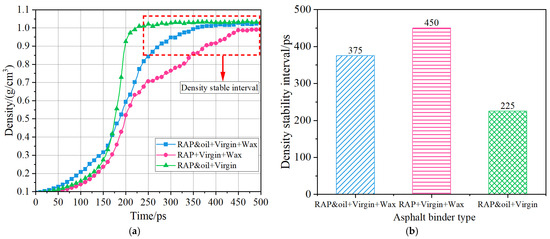 As detailed in Section 3.4, identical microcracks were created in all three asphalt molecular systems, and the NPT molecular dynamics simulations were subsequently performed on these three systems. The density curves of the three systems during the 500 ps simulations are drawn in Figure 12a. As the density curve of the asphalt binder stabilizes, it can be regarded as indicating fully self-healed microcracks. Evidently, different asphalt molecular systems have different self-healing abilities, as presented in Figure 12b. With regard to the Aged + virgin + wax asphalt binder, the self-healing time is about 450 ps, which is the longest one among the three asphalt binders. This indicates that the self-healing performance of the Aged + virgin + wax asphalt binder is poorer than the other two asphalt binders. After oxidative aging, the small and medium molecules in the RAP binders (i.e., aromatic molecules and saturate molecules) were gradually converted into macromolecules (asphaltenes and resins). Due to this change, the reduction in light components in the Aged + virgin + wax asphalt binder causes a decrease in asphalt fluidity, thereby leading to a low self-healing rate. As presented in Figure 12, it is evident that incorporating aromatic oils into the Aged + virgin + wax asphalt binder enhances its self-healing capabilities, as indicated by the earlier attainment of density stabilization (375 ps). This accounts for the presence of aromatic oils replenishing some small aromatic molecules into the asphalt binder, thus improving the asphalt fluidity. Note that the self-healing time of the Aged and oil + virgin asphalt binder is the shortest at 225 ps. This may be due to the fact that the organic waxes presented as solids at the simulated temperature of 298.15 K increased the stiffness of the asphalt, which is not favorable for the flow of the asphalt binder. Hence, the asphalt binder, without the incorporation of organic waxes, manifests the best self-healing performance. It is important to mention that the density values presented in Figure 12 do not align with the density change trend observed in Table 4, potentially resulting from the disparity in simulated temperatures.