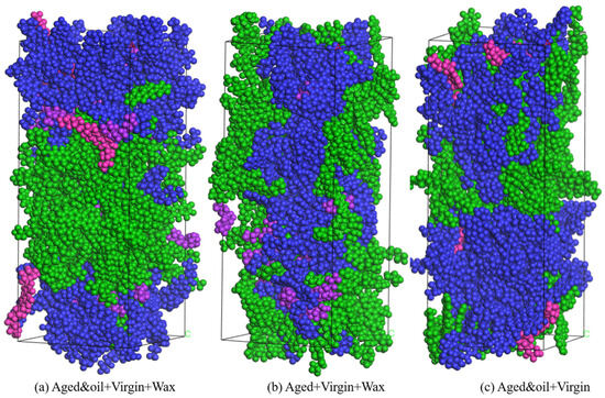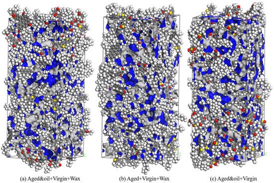 The investigation of the free volume offers valuable insights into the movement and distribution of the four SARA components within asphalt. Figure 13 clearly illustrates the spatial arrangement of the free volume (represented by blue areas) within the three asphalt molecular systems. It is evident that the free volume is nearly evenly spread across the gaps in the asphalt molecular system. Table 5 describes the calculated values of the occupied volume (grey parts), free volume, and FFVs of the three asphalt molecular systems. The free volume of the asphalt binder with organic waxes but without rejuvenators slightly decreased (from 22.02% to 21.9%) in comparison to the asphalt binder with organic waxes and rejuvenators, implying that the asphalt molecular structure becomes more compact, increasing the van der Waals volume and reducing the gaps between unoccupied molecules. This phenomenon is plausible, and it has also been reported in many previous studies [49]. When an appropriate number of rejuvenating agents is added, the dosage of nonpolar or low-polar aromatics in the RAP binder is enriched again, positively influencing the increase in free volume, thereby enhancing the rheological properties of the asphalt binder. Furthermore, the asphalt binder with rejuvenators but without WMA additives manifests the lowest free volume (21.03%) among these three binders. A possible explanation is that organic waxes adsorb and dissolve in the wax- or oil-based molecules in the asphalt binder at high temperatures (433.15 K equals 160 °C), thus accelerating the melting and movement of the asphalt molecules, which helps increase the free volume of the asphalt binder. Consequently, this phenomenon leads to the worst free volume of the asphalt binder with rejuvenators but without WMA additives.