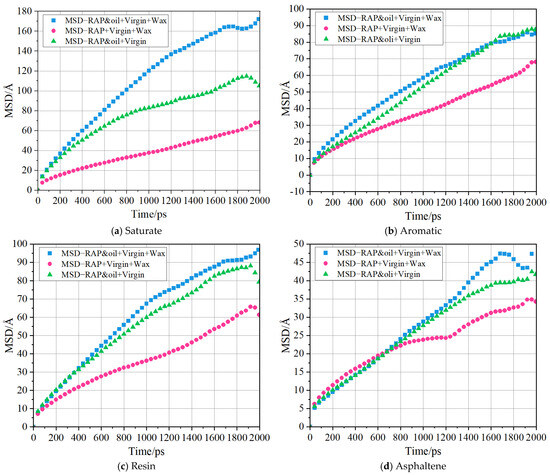 During the MD simulations, the asphalt molecules of the four SARA components move continuously from their initial position until a dynamic equilibrium is achieved. The warm mix regeneration process between the RAP binders and the virgin binders was highly influenced by the interaction of the WMA additives and rejuvenating agents. Hence, it is crucial to explore the diffusion characteristics of the SARA components. To determine the distributions of the SARA components at the molecular level, the mean square displacement (MSD) and self-diffusion coefficient (D) were calculated using Equation (7):