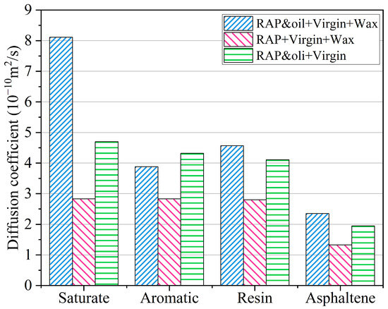 As illustrated in Figure 15, each SARA component in the asphalt binder undergoes diffusion in an approximation based on its molecular weight due to a combination of intermolecular forces and thermodynamic motion. Owing to their small molecular weight and simple molecular structure, saturated substances have the highest self-diffusion rates, followed by resins and aromatics. Asphaltene manifests the slowest self-diffusion velocity as a result of its significant molecular mass, intricate structure, and tendency to self-assemble driven by π-π stacking interactions involving benzene rings. Furthermore, the self-diffusion coefficients of the asphalt binder with organic waxes but without rejuvenators are the lowest among these three asphalt binders. It accounts for the presence of aged RAP binder in the RAP + virgin + wax asphalt binder. After the oxidative aging of asphalt molecules, the volume and content of the resin and asphaltene increase. It leads to the FFV of aged asphalt becoming smaller, i.e., the unoccupied volume becomes smaller (as discussed in Section 4.5), implying that the aged RAP binder lacks sufficient room for the diffusion of SARA molecules. After incorporating 5% aromatic oils, the observations show a significant improvement in the self-diffusion coefficients of the RAP and oil + virgin + wax asphalt binder. It illustrates that the rejuvenators may provide an effective space for the diffusion of the SARA components and, meanwhile, improve the compatibility of WMA additives with asphalt molecules, substantially facilitating the degree of self-diffusion of the SARA components.