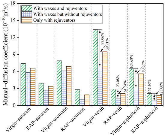 The blending process between the virgin and RAP asphalt binder is referred to as mutual diffusion, ascribed to the interaction of the different types of molecules in the asphalt system. Exploring the mutual diffusion of the asphalt molecular system is conducive to revealing the regulation behavior of WMA additives and rejuvenating agents in the blending process of virgin and RAP asphalt binders. Hence, in addition to the self-diffusion coefficients, the mutual diffusion coefficients of the SARA components are also calculated using Equation (8), as demonstrated in Figure 16. As depicted in this figure, the diffusion coefficient of the virgin binders is generally higher than that of the RAP binders, indicating that the blending of the two binders occurs primarily through the diffusion of the virgin binders. The SARA molecules in the mutual diffusion system manifest a marginally different diffusion behavior in comparison to self-diffusion. The resin evolves into the most active fraction, and its diffusion velocity exceeds that of light components such as aromatic and saturate fractions. Additionally, asphaltenes still maintain the slowest diffusion velocity of the three asphalt molecular systems, especially for the asphalt molecular system containing organic waxes but no rejuvenators. The mutual diffusion coefficient of virgin asphaltene in the Aged + virgin + wax asphalt binder is 3.1 × 10−10 m2/s, while the aged asphaltene is only 0.8 × 10−10 m2/s. As discovered in 4.5, without the presence of rejuvenators, the high polar oxygen atoms that have undergone oxidative aging generate stronger intermolecular forces, resulting in the self-aggregation of the RAP asphaltenes. An increase in the viscosity of RAP binders significantly influences the diffusion and flow behavior of long-chain molecules like resins and asphaltenes. Under these conditions, the mutual diffusion between the RAP and virgin binders is notably slow, particularly for the RAP components. This fact suggests that the de-aggregation of aged asphaltenes may be the key to improving the full blending of virgin and RAP asphalt binders.
