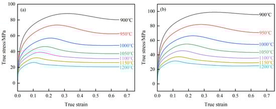 Figure 2 illustrates the true stress–strain curves of 40CrMnMoA alloy steel under a range of deformation conditions. Observably, the stress exhibits an initial rise followed by a decline in response to increasing strain, particularly at lower strain rates. For example, under the condition of 0.005 s−1, 900 °C, the stress of the steel first reaches the peak stress of 88 MPa, then gradually decreases to 80 MPa and stabilizes, exhibiting the typical characteristics of a DRX curve. This phenomenon stems from the effects of work hardening. Initially, as deformation commences, the swift proliferation and interaction of dislocations in metal amplify the resistance they encountered during movement, resulting in a rapid increase in flow stress. With the deformation of metal, the dynamic recovery (DRV) effect is intensified, slowing down the increased rate of flow stress. Upon reaching the critical strain, DRX occurs within the metal; the metal is simultaneously influenced by the combined effect of DRV and DRX. The stress value gradually rises to a peak and then begins to decline. Ultimately, the stress stabilizes when the combined effect of DRV and DRX offset work hardening. This transformation illustrates the complex interaction of microstructure changes on the mechanical response of materials. At high strain rates, this characteristic exists only at high temperatures. For instance, under the condition of 5 s−1, 1200 °C, the stress of 40CrMnMoA alloy steel initially reaches a peak stress of 91 MPa, then gradually decreases to 90 MPa. This is due to the fast deformation rate, which results in the short nucleation time and incomplete dynamic recrystallization. In addition, the stress reduction in this case is relatively small. At low temperatures and elevated strain rates, the stress of 40CrMnMoA alloy steel exhibits a gradually increasing trend. For example, at the condition of 5 s−1, 900 °C, the flow stress climbs progressively alongside strain, peaking at 202 MPa, beyond which it levels off, indicative of a DRV curve characteristic. At the outset, stress escalation is swift with strain escalation, a consequence of work hardening. With ongoing deformation, DRV mitigates the hardness of the material, decelerating the flow stress’s ascent until it plateaus.