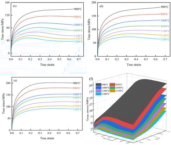 True stress–strain curves of 40CrMnMoA steel under various deformation conditions: (a) 0.005 s−1; (b) 0.01 s−1; (c) 0.1 s−1; (d) 1 s−1; (e) 5 s−1; (f) 3D response surface graph of true stress–strain.