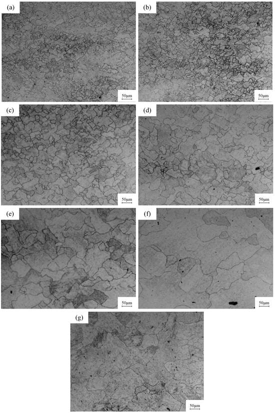 Microstructures of 40CrMnMoA alloy steel at different temperatures under 0.005 s−1 strain rate: (a) 900 °C; (b) 950 °C; (c) 1000 °C; (d) 1050 °C; (e) 1100 °C; (f) 1150 °C; (g) 1200 °C.