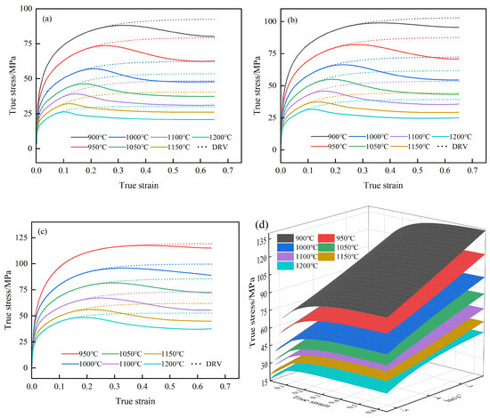 DRV curve and DRX curve of 40CrMnMoA under different conditions: (a) 0.005 s−1; (b) 0.01 s−1; (c) 0.1 s−1; (d) 3D response surface graph of recovery stress–strain.