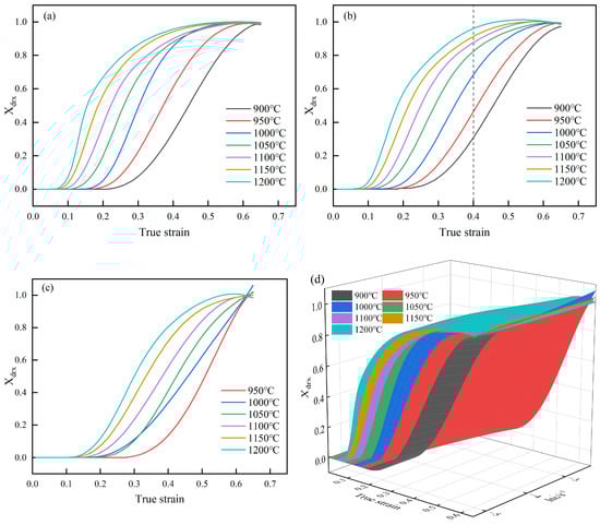 By integrating Equation (5) with the data from Figure 6, the dynamic recrystallization fraction () for 40CrMnMoA under different conditions was calculated and presented in Figure 7. In general, with increasing strain, the percentage of DRX shows an S-curve increasing trend. It can be seen from Figure 7a–c that at fixed strain and strain rate, the percentage of DRX increases with increasing temperature, which can also be seen from Figure 7d. For example, when the strain rate is 0.01s−1 and the strain is 0.4, the percentages corresponding to 900, 950, 1000, 1050, 1100, 1150, and 1200 °C are: 31%, 46%, 68%, 83%, 88%, 91%, 96%. In addition, Figure 7d reveals that the percentage of DRX increases as the strain rate decreases.