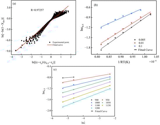 According to Equation (8), when and , can be deduced. A plot of can be established, where the slope represents , as shown in Figure 8a. In addition, at a constant strain rate, a plot of can be created, where T is the temperature in Kelvin, and the slope corresponds to , as depicted in Figure 8b. When the temperature is constant, a plot of can be constructed, with the slope being , as illustrated in Figure 8c. Once and are determined, they can be substituted into Equation (7) to ascertain . The model parameters determined, based on the traditional averaging method, are , J/mol, , . The determined characteristic strain model is illustrated in Equation (10):