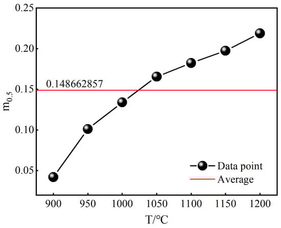 The traditional averaging method is a highly convenient approach for determining model parameters. However, the parameters obtained by this method will fluctuate under different conditions, and the interaction between variables is not taken into account, which limits its accuracy and has certain inherent limitations. For example, when determining the characteristic strain model parameter , the values obtained under different temperatures using the traditional averaging method, along with their mean value, are depicted in Figure 9. The dots represent the values obtained at 900, 950, 1000, 1050, 1100, 1150, 1200 °C, and the red line represents the average of these values, which is the parameter in the obtained characteristic strain model. Through Figure 9, it is evident that there is considerable variation in the values ascertained at different temperatures, with significant discrepancies from the mean value, thereby demonstrating the inherent limitations of the traditional averaging method.