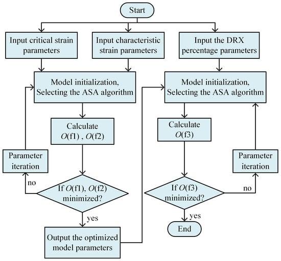 The optimization process of the dynamic recrystallization model based on the ASA algorithm is depicted in Figure 10. The process commences with the input of pertinent experimental parameters, such as temperature, strain rate, and the associated critical and characteristic strains. This is followed by an initialization phase, where the critical and characteristic strain models are entered, initial parameter values and their ranges are set, and the ASA algorithm is chosen. The objective functions, and , are then computed. It is then ascertained whether these functions were minimized; if they are, the current model parameters are output. If not, adjustments are made to the parameters, and the functions are re-evaluated. The optimization of the critical strain and characteristic strain model parameters are conducted in tandem. Post-optimization of these parameters, they are introduced into the DRX volume fraction model’s optimization sequence, adhering to the same procedure for further optimization.