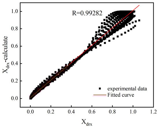 Based on Equations (16)–(18), the values of R, AARE, and RMSE of the DRX percentage model before and after optimization were calculated and recorded in Table 5. It indicates that after optimization by the ASA algorithm, the R-value improved from 0.925 to 0.992; concurrently, the AARE and RMSE were reduced from 92.131 and 0.047 pre-optimization to 60.945 and 0.046 post-optimization. Figure 12 presents a comparison of the predicted DRX percentages with experimental data, demonstrating a significant correlation. Therefore, the model optimized by the adaptive simulated annealing algorithm can more accurately describe the DRX behavior of 40CrMnMoA alloy steel.