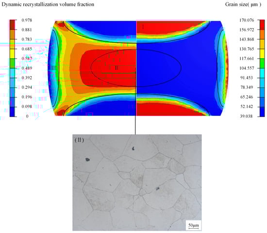 Figure 13 shows the simulation results of isothermal compression of cylindrical specimens at 1100 °C and 0.01 s−1. On the left is the cloud plot depicting the DRX volume fraction, while the right displays the grain size distribution. Below these is the metallographic image of the central region of the sample under corresponding conditions. The deformed specimen can be broadly divided into three areas: hard deformation region (I), large deformation region (II), and small deformation region (III). Due to limited deformation in Zones I and III, dynamic recrystallization is incomplete, so the discussion here focuses on the significantly deformed area. At the core of the cylindrical specimen (Zone II), the dynamic recrystallization volume fraction is the highest, reaching 0.978, with a grain size of 42.331 μm. The metallographic analysis reveals a grain size of 45.256 μm, yielding a relative discrepancy of 6%.