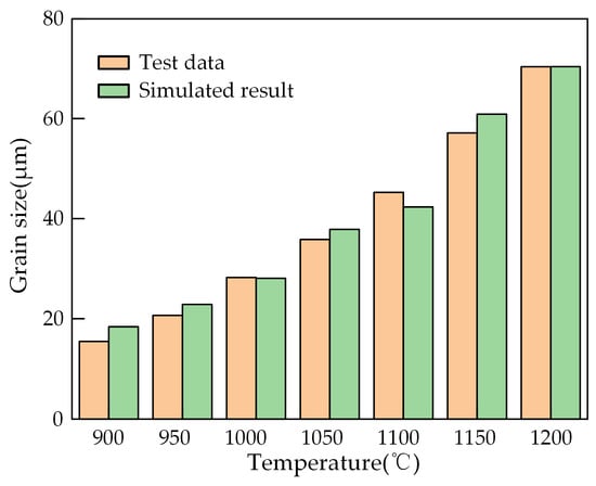 The simulation of the compression process of 40CrMnMoA was calculated at 900, 950, 1000, 1050, 1150 and 1200 °C at a strain rate of 0.01s−1. The grain size in the central region of the simulated sample was compared with that in the central region of the metallographic photo, as shown in Figure 14, and the relative error was 3%. This indicates that the established DRX model possesses a high level of prediction accuracy and is suitable for predicting the DRX behavior of 40CrMnMoA alloy steel, and further proves the effectiveness of the inverse optimization method used.