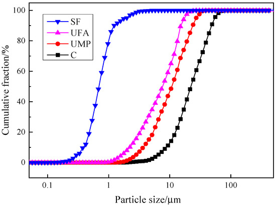 The cement adopted is ordinary Portland cement (C) of grade 52.5 from Gansu Qilianshan Cement Group Co., Ltd. in Lanzhou, China, and over 60% of the particles have a size of 10–30 μm. UMP, sourced from Ying’an Environmental Protection Material Technology Company located in Dezhou, China, as shown in Figure 1, has over 60% of particles sized 3–17 μm. UFA, sourced from Zhiqiang Fly Ash Plant located in Pingdingshan, China, as shown in Figure 2, has over 60% of particles sized 2–12 μm. Silica fume (SF), sourced from Lixinyuan Microsilica Powder Company located in Lanzhou, China, has over 60% of particles sized 0.4–0.9 μm. The particle size distributions of the above four materials are plotted into a curve as presented in Figure 3. Evidently, ranked by decreasing particle size, they are C > UMP > UFA > SF. SF, with the smallest particles, can effectively fill micropores. Cement (C), having the largest particles, is the primary material for hydration. The overall particle size of UFA is smaller than that of UMP, and both fall between SF and C.