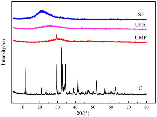 The chemical composition of cement (C), ultrafine powder (UFA, UMP), and silica fume (SF) is shown in Table 1. The XRD spectra of the four gelling materials is shown in Figure 4. Compared to C, UMP, UFA, and SF have more silica and alumina, which can facilitate the formation of more minerals in UHPC, such as dicalcium silicate (C2S), tricalcium silicate (C3S), and tricalcium aluminate (C3A). These minerals are the main components influencing the strength of UHPC and can effectively enhance the mechanical and durability properties of UHPC [37].