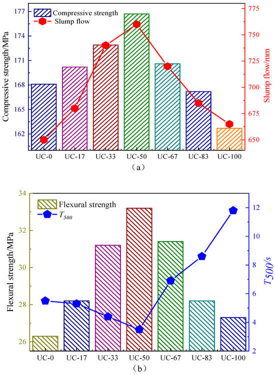From the viewpoint of workability, as can be seen from Figure 6a, with the increase in the ratio of UMP replacing UFA, the slump flow of UHPC shows a trend of first increasing and then decreasing. When the ratio of UMP replacing UFA is less than 50%, the slump flow value increases. The collapse extension degree of UC-0, UC-17, UC-33, and UC-50 is 650 mm, 680 mm, 740 mm, and 760 mm, respectively. Using UC-0 as the control group, the collapse extensibility of UC-17, UC-33, and UC-50 is improved by 4.6%, 13.8%, and 16.9%. Conversely, when the ratio of UMP replacing UFA is more than 50%, the slump flow value decreases. The collapse extension degree of UC-50, UC-67, UC-83, and UC-100 is 760 mm, 720 mm, 685 mm, and 665 mm. Using UC-50 as the control group, the collapse extensibility of UC-67, UC-83, and UC-100 decreases by 5.3%, 9.9%, and 12.5%, respectively.