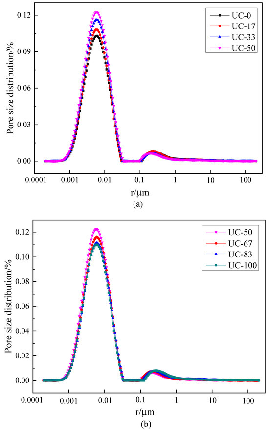 Pore size distribution of UHPC when UMP and UFA were mixed: (a) ratio of UMP replacing UFA is less than 50%; (b) ratio of UMP replacing UFA is larger than 50%.