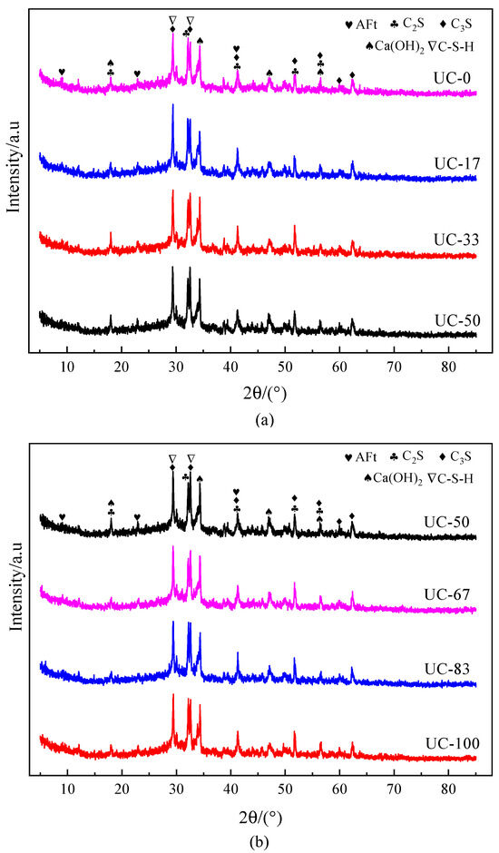 The XRD spectra of UHPC net slurry hydration products when UMP and UFA were added are shown in Figure 8, where Figure 8a shows when the ratio of UMP replacing UFA is less than 50%, while Figure 8b shows when the ratio of UMP replacing UFA is more than 50%.