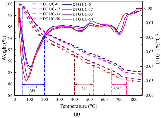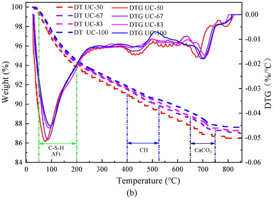 From Figure 9a, the first obvious heat absorption peak in the DTG curves occurs between 60 °C and 200 °C, which is mainly a result of the dehydration of hydrated calcium silicate gel (C-S-H) and ettringite (AFt), exhibiting a significant enhancement with the increase in the dosage of UMP replacing UFA. The second obvious heat absorption peak occurs between 370 °C and 530 °C, which is mainly due to the dehydration decomposition of CH and shows an obvious increasing trend with the increase in UMP dosage. The third distinct heat absorption peak is located between 660 °C and 770 °C and corresponds to the dehydration decomposition of calcium carbonate (CaCO3). Based on the DTG curves, the common weight loss of C-S-H and AFt between 60 °C and 200 °C is calculated, and the weight loss of UC-17, UC-33, and UC-50 increases by 0.07%, 0.85%, and 1.43%, respectively, using UC-0 as the control group. The weight loss of CH between 370 °C and 530 °C is calculated, and the weight loss of UC-17, UC-33, and UC-50 increases by 0.21%, 0.34%, and 0.38%, respectively, using UC-0 as the control group. This indicates that when using UMP to replace UFA for compound admixture, the CH consumption rises with the increase in UMP replacing UFA, and more C-S-H gels are generated.