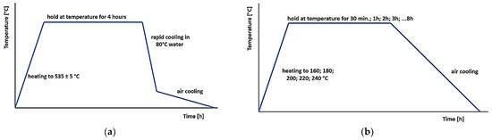After the casting process, the samples were prepared for heat treatment. In the first step of heat treatment, all samples were subjected to the solution treatment. The solution treatment temperature was set to 535 °C ± 5 °C. This temperature is commonly used in practice. A higher temperature could lead to local melting of the sample, which would negatively affect the resulting properties. After ramping up to this temperature, the samples were left in the oven for 4 h to ensure a complete solution of all curing inter-metallic phases, particularly the Mg2Si phase, as this phase needs more time to dissolve than Al2Cu. It was also important to observe the cooling conditions to avoid reverse segregation of the intermetallic phases. Specifically, this involved the time of sample transfer and the temperature of the cooling medium. The time between opening the oven door and immersion of the samples in water must not exceed 20 s. The cooling medium was hot water at 80 °C. After cooling to 100–150 °C, the samples were cooled to ambient temperature in air. The thermal cycle was monitored and recorded using a thermocouple attached to one of the samples. A graphical representation of the solution treatment for the present work is presented in Figure 1a.