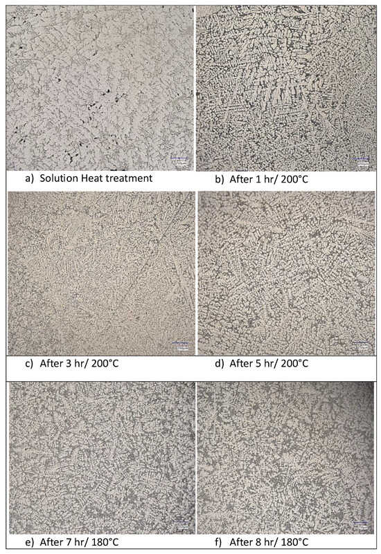 The effect of solution treatment resulted in spheroidization of the eutectic silicon, and the α phase manifested as rounded grains. Artificial aging caused a change in the structure. The morphology was visibly finer, but there was no marked difference between the samples. Although there was not much difference in the given microstructure images, the mechanical property measurements confirmed that the different temperatures and times of artificial aging had a great influence on the hardness and strength properties of the AlSi7Cu0.5Mg alloy. It is assumed that the hardness and strength were reached in the region of coherent precipitate formation, possibly at the beginning of the deposition of the partial coherent θ′ phase [35,36,37]. The long heat treatment process eliminated the stable θ′ phase (Al2Cu), resulting in a decrease in the mechanical properties. This was especially true for the samples processed above 200 °C.