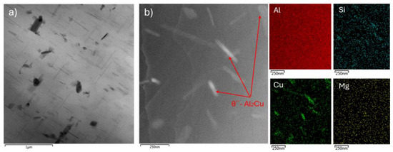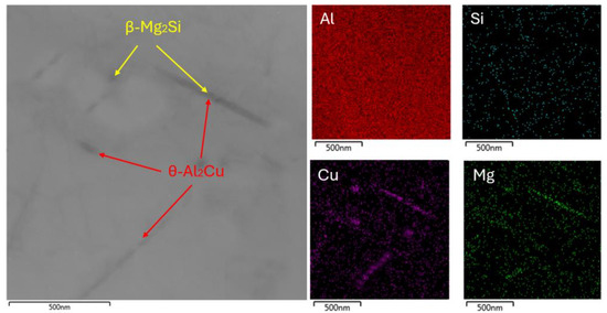 The substructure of the sample aged at 180 °C for one hour is characterized by a smaller number of present precipitates. Energy dispersive spectroscopy (EDS) mapping showed that the rod-like particles were primarily composed of Mg2Si (Figure 4). These precipitates were present in the form of thin needles and locally in the form of rounded grains. The lower number of coherent β″-Mg2Si precipitates in the substructure was related to the short aging time (1 h) at 180 °C, where the aging process only reached the initial stage of coherent cluster formation.