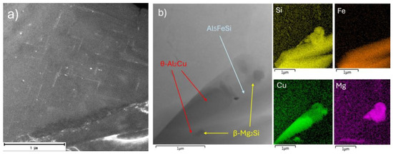 On the other hand, a 7 h holding time at a temperature of 220 °C, similar to the 200 °C for 7 h sample, led to the formation and presence of incoherent phases in the substructure (Figure 8b). The formed phases of the θ-Al2Cu or β-Mg2Si type were present in grains with larger dimensions near the Fe-based phase AlFe5Si.