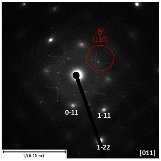 The selected area electron diffraction (SAED) experimental technique is part of a transmission electron microscope. SAED provides information about the crystallography and orientation of crystalline materials (Figure 9). In the SAED image, the regularity of the maxima (lines) of the precipitates θ′ can be observed, which indicates their regular orientation relative to the matrix and is precisely crystallographically determined.