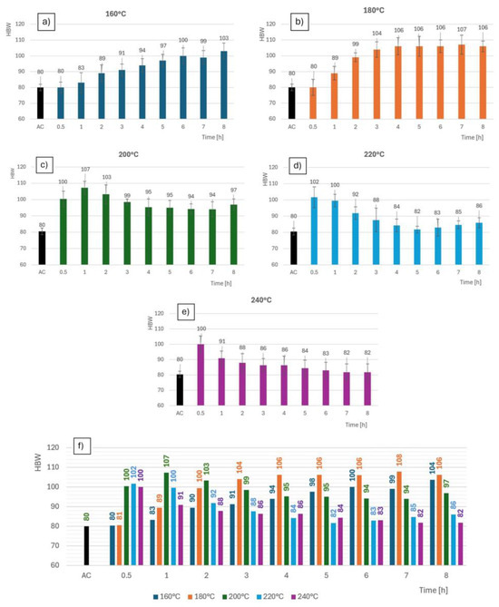 Dependence of hardness on time; for samples (a) 160 °C; (b) 180 °C; (c) 200 °C; (d) 220 °C; (e) 240 °C; (f) all samples comparison.