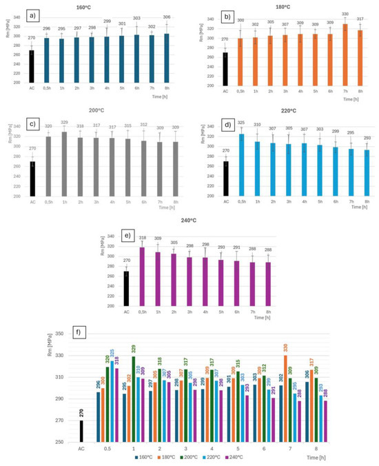 The mechanical properties were evaluated by comparing the tensile tests. A minimum of five specimens were torn from each thermal regime. The results in the graphs are always their average values. By processing the results into a graphical dependence, it was clearly demonstrated that there were significant differences in terms of the ultimate strength evaluation Rm [MPa]. The Rm value of 270 MPa shows the alloy after the solution treatment (i.e., the initial condition). The greatest increase in strength was presented by the heat treatment at 180 °C for 7 h, showing an increase of 60 MPa compared with the initial condition. The average strength values are shown in Figure 12.