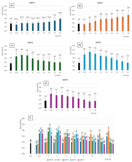 - The highest value of the yield strength (Rp0.2 [MPa]) was 245.1 MPa at 220 °C for 1 h, and the lowest (Rp0.2 = 215.4 MPa) was valid at 160 °C for 1 h.