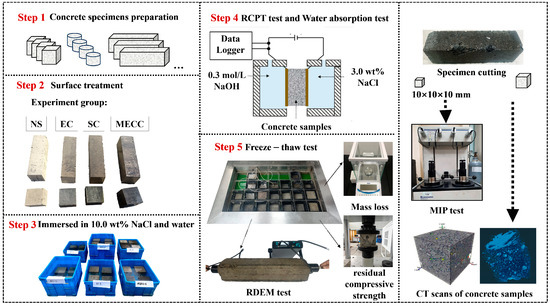 In addition, following the “Standard for test methods of long-term performance and durability of ordinary concrete” (GB/T50082-2009) [32], we applied a new test procedure and tested the cement concrete specimens by erosion and freezing and thawing, as shown in Figure 1. First, three specimens per group (100 mm × 100 mm × 400 mm) were treated and then eroded in 10.0 wt% NaCl solution for 120 days. Then, we took the specimens out, tested their initial ultrasonic velocity, and then subjected them to rapid freezing and thawing for 200 cycles in 3.5 wt% NaCl solution according to the main snow-melting agent used in highway projects [9,27]. The rapid freeze–thaw test was conducted at the maximum and minimum temperatures of 5 °C ± 2 °C and −18 °C ± 2 °C, with each cycle lasting 4 h. After every 25 cycles, we tested the mass loss of the specimen, and after every 40 cycles, the relative dynamic elastic modulus (RDEM) was calculated by ultrasonic pulse velocity measurements [33]. The RDEM () for concrete specimens was determined using Equation (1), where e and represent the ultrasonic pulse velocity, respectively. After 200 freeze–thaw cycles, the samples were taken out and cut into 100 mm cubes, and their residual compressive strength was measured.