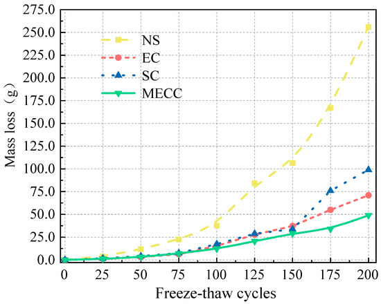 The NS specimens ranked the worst for all three evaluation criteria, with the largest average mass loss (256 g). None of the coating specimens suffered aggregate spalling except some surface damage for the SC and EC specimens. The surface morphology of the MECC specimens was well intact. The average mass loss of the coating specimens was 99 g (SC), 71 g (EC), and 49 g (MECC), which were 38.67%, 27.73%, and 19.14% of that of the NS group. Throughout the freeze–thaw test, the surface damage of the NS specimens intensified after 50 freeze–thaw cycles, and their mass loss became obvious. For the coated specimens, due to the protective surface coating, the mass loss took place more mildly and slowly. The mass loss did not intensify significantly for the SC and EC groups until after 150 cycles; whereas the mass loss rate of the MECC group remained almost unchanged throughout the test, suggesting that MECC provides a reliable surface protection for concrete structures.