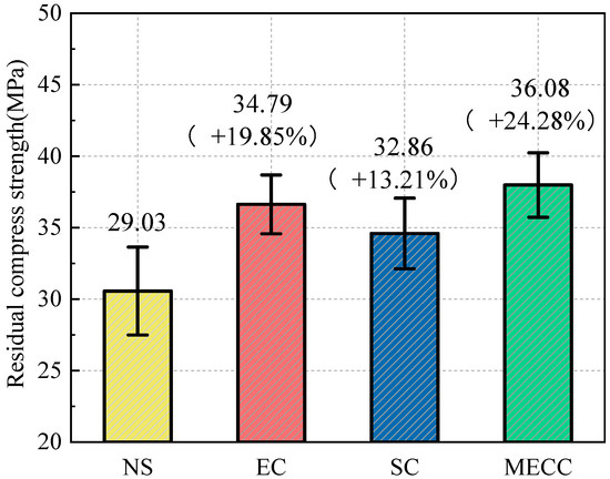 Residual compressive strength is another important criterion for evaluating the degree of internal damage of concrete specimens [34,35]. As shown in Figure 4, the residual compressive strength of the NS specimens was 29.03 MPa, which was about 63.10% of the initial level. For the SC, EC, and MECC specimens, the residual compressive strengths were 32.86 MPa, 34.79 MPa, and 36.08 MPa, respectively, representing 13.21%, 19.85%, and 24.28% increases compared to the NS specimens. These results confirm that surface coatings can effectively enhance the frost resistance of concrete. The MECC samples had better frost resistance, which is encouraging for the continued research and development of this new type of surface treatment.