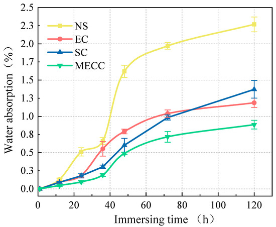 As a physical barrier for protecting cement concrete, one of the roles of a coating is to largely reduce water intrusion into the interior of concrete, thereby reducing icing pressure and consequently the freeze–thaw damage under repeated freezing and thawing [3,36]. The water absorption test is to detect how different types of coating prevent water intrusion into the interior of concrete. Figure 6 compares the water absorption test results of different specimens. When the specimens were immersed in water, the water absorption of the NS specimens increased steeply over the first 48 h. As the immersion time further increased, they slowed down water absorption and became saturated at 2.16%. For the coating samples, the water absorption was much lower, as previously expected, being 1.32% (SC), 1.13% (EC), and 0.93% (MECC). The MECC specimens had the lowest water absorption, which was 56.94% lower compared with the NC specimens. The EC specimens showed roughly the same water absorption increase as the MECC specimens; they absorbed water at a slowly increasing rate over the first 36 h and were nearly saturated when immersed for more than 48 h. Notably, the water absorption of the SC specimens was still rising even after 72 h, which is consistent with previous studies [2], suggesting that silane cannot prevent external solutions from intruding when oversaturated. Furthermore, as environmental solutions act as vehicles for aggressive ions, such as chloride ions, from coming into the interior of concrete, low water absorption can also result in a reduction in total chloride ion intrusion and reduce freeze–thaw damage induced by chloride [36,37], as will demonstrated in Section 3.3.