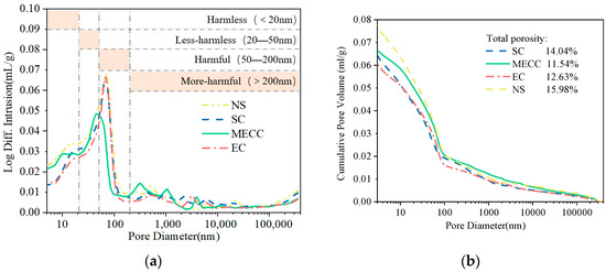 The pore structure distribution in the surface layer of the concrete specimens was tested by the MIP test. After the freeze–thaw test, the specimens were taken out and cut to the desired size (10 mm×10 mm × 10 mm). Figure 8 compares the pore structure of the specimens. The total porosities of the NS, SC, EC, and MECC specimens were 15.98%, 14.04%, 12.63%, and 11.54%, respectively. The lower overall porosity of the coated specimens compared with the NS specimens was attributed to the physical barrier provided by the three protectants. However, in terms of pore type, MECC improved the pore structure of cement concrete more remarkably. Concrete pores are categorized into harmless, low-harm, harmful, and high-harm pores. The pore sizes include <20 nm, 20–50 nm, 50–200 nm, and >200 nm [39], as shown in Table 6. Two positive changes can be detected in the internal pore distribution of the MECC specimens. Firstly, the number of >50 nm harmful pores and the proportion of harmful pores reduced. Compared with the NS, EC, and SC specimens, the number of harmful pores (>50 nm) in the MECC specimens was 31.69%, 34.47%, and 48.02% smaller. Secondly, the proportion of 20–50 nm low-harm pores was larger. Compared with the NS, EC, and SC specimens, the number of <50 nm low-harm pores in the MECC specimens was 29.25%, 35.37%, and 28.60% larger, respectively. This indicates that under the same freeze–thaw conditions, MECC greatly prevented the deterioration of the concrete microstructure, reduced total porosity level, increased the number of harmless and low-harm pores that benefit frost resistance, and relieved the damage to the surface structure [38,39]. If additional frost resistance experiments were performed, it is expected that MECC specimens would demonstrate a longer freeze–thaw life than the other groups. For the EC and SC specimens, aside from a smaller proportion of high-harm pores (>200 nm), the pore distribution was similar to that of the NS specimens, aligning with the results described in Section 3.1. After 200 freeze–thaw cycles, the physical barrier in the SC and EC specimens was nearly consumed and their microstructure deteriorated, leaving unevenly distributed pores and cracks on the surface. For the MECC group, as the internal structure was denser, under the same freezing and thawing conditions, the physical protection did not disappear completely. Hence in terms of surface morphology, only part of the MECC specimens was locally damaged by erosion and the other areas remained intact. However, further studies are required to confirm this possibility.