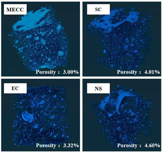 The internal damage of the coated specimens and NS specimens was further determined by CT scanning. These specimens were taken from the concrete’s inner area, about 2–6 cm from the surface. Figure 9 compares the three-dimensional reconstruction images of the internal structure of the specimens. Table 7 provides the pore structure characteristics. After 120 d of salt erosion and 200 freeze–thaw cycles, the total porosities of the internal structures of the NS, SC, EC, and MECC specimens were 4.60%, 4.01%, 3.32%, and 3.00%, respectively. Compared with the result of the MIP test in Figure 8, it can be seen that the freeze–thaw damage to the concrete pore structure mainly occurs at the surface. The porosity of the internal structure can be directly observed in Figure 9. Consistent with the MIP test results, the coating groups had less internal freeze–thaw damage, and MECC provided beneficial protection to the internal structure of concrete.