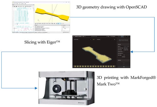 The specimens were prepared for printing by using the dedicated proprietary slicing software Eiger™ (https://www.eiger.io/, accessed on 1 February 2025). The slicer starts by importing the geometry saved in an STL file, then it allows for defining the layer sequence. In particular, it allows for defining the number and sequence of composite layers and, for each layer, for defining the orientation of the fiber (at least for the basic pattern of fiber parallel and aligned in a single direction). Figure 1 aims to describe the preparation process of the samples.