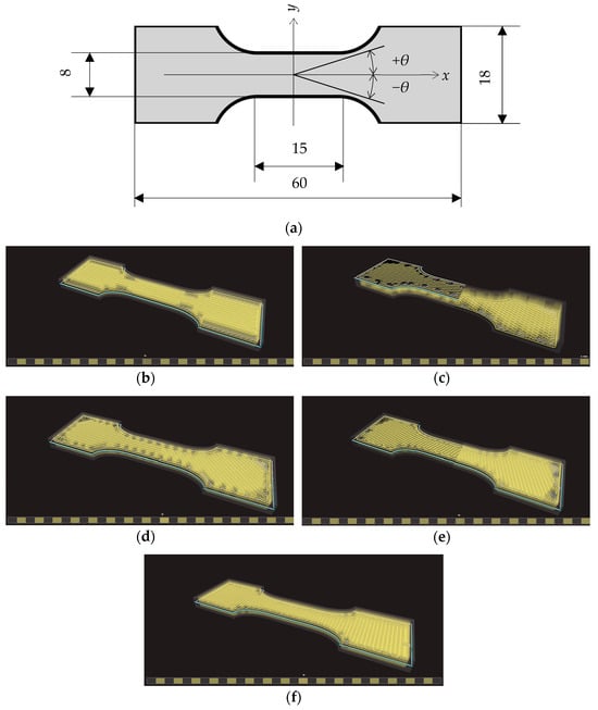 Geometry and layering scheme of the used specimen: (a) plane top section of the specimen, thickness 3.2 mm; (b) sample with fibers aligned at 0° orientation, image from Eiger™ slicing software; (c) fibers at ±23°; (d) fibers at ±45°; (e) fibers at ±67°; (f) fibers at 90°.