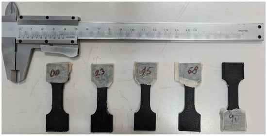 In Figure 5, some broken samples after the tensile tests are shown. The samples were not loaded until complete failure and separation; the tests were stopped after the failure occurred in one or some composite layers, and the load dropped by a significant amount. The information obtained was considered sufficient for the main aim of this work, which is to validate the model and to identify the relevant model parameters. Therefore, the type of failure is not really obvious, and it is presumably a combination of fiber failure and matrix cracking. This will be confirmed in the following analysis of the failure criteria.